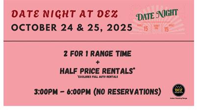 Date night at the range returns October 24 and 25. Bring your date and enjoy 2 for 1 range time and half priced rentals. Starting at 3:00 PM.