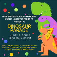 Ready for a ROARING good time? Children and their adult/s are invited to the library to craft a simple dinosaur costume and then to parade around the downtown square. Weather permitting, the parade will begin at approximately 4:00 PM and we will return to the library by 4:15PM. Register only the name of the child that will be participating. All materials for creation will be provided by the library, but feel free to bring items from home to supplement a costume or if you have something specific in mind. Please no weapons or possibly dangerous items.