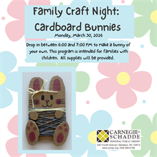 Families with children are invited to drop in the Youth Program Room between 6:00 PM and 7:00 PM to create a Springtime bunny out of cardboard. All materials will be provided and caregivers will be expected to stay with their child to complete the craft.